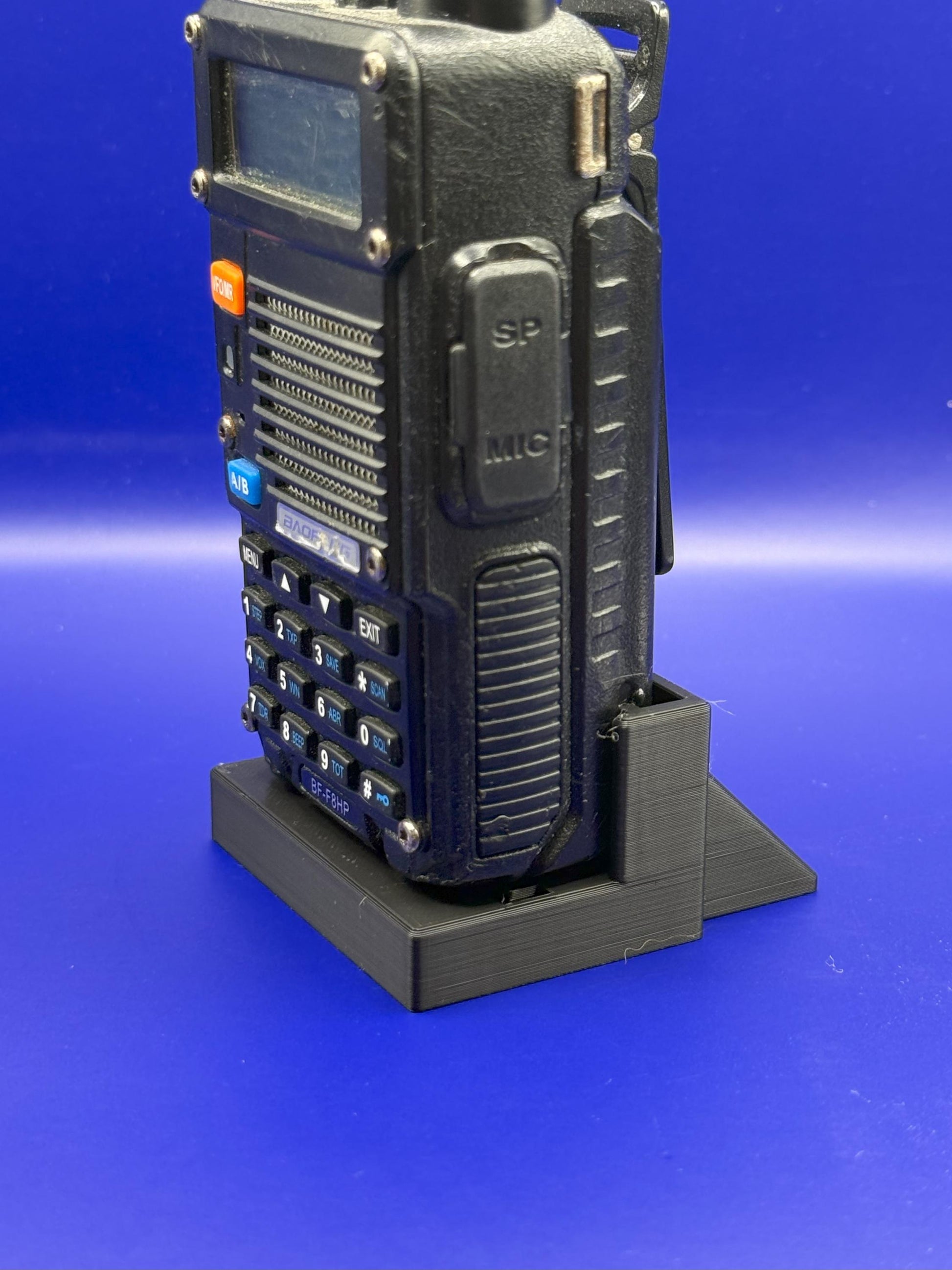 This is the item you need for your Baofeng radio! I was tired of my radio falling over while sitting upright on my desk, so I created the Baofeng Desk Stand to secure my radio while monitoring and transmitting on the air, keeping it safe from harm while looking professional in the process.